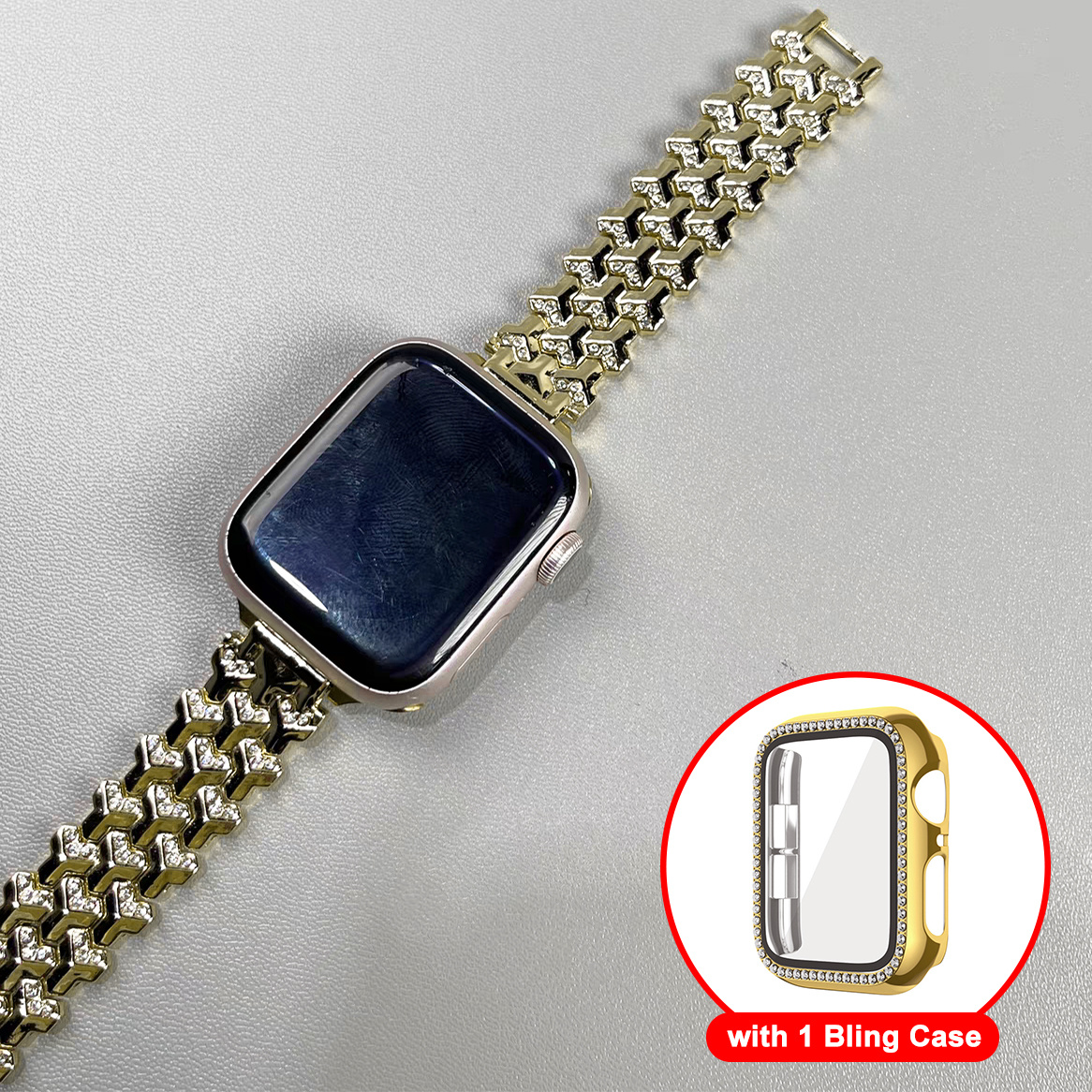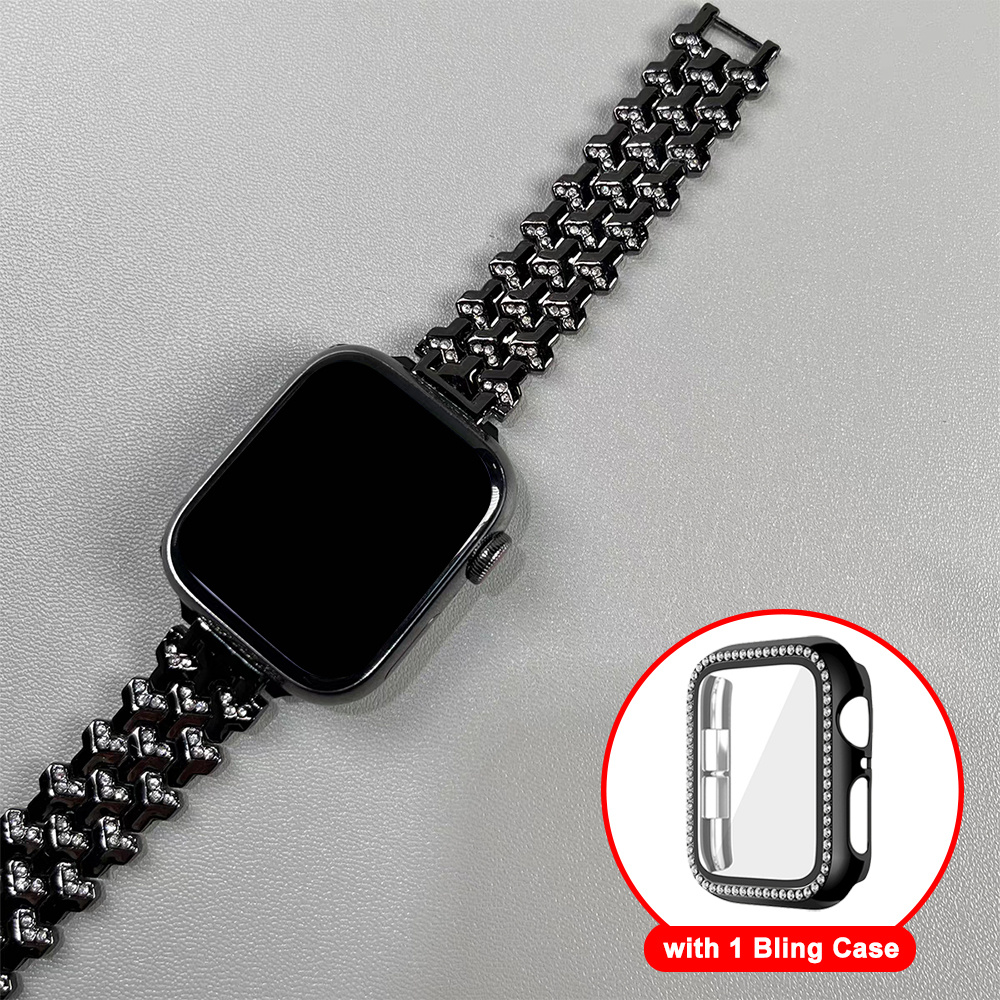 适用于苹果手表表带 38mm 40mm 41mm 42mm 44mm 45mm 46mm 49mm,含1个保护壳,女士款珠宝替换金属表带,带闪亮PC保护壳,适用于iWatch Ultra SE/SE系列/11/10/9/8/7/6/5/4/3/2/1